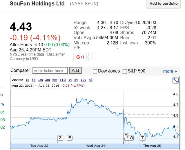 固然搜房本季度仍舊爆出巨虧,但環比而言,虧損金額已經大幅度減少;而且本季度的EPS 也大大好于華爾街的預期。不外似乎華爾街目前并不買賬,今天業績公告之后,搜房的股價收盤價格跌幅超過4%,交易量超過550萬個ADS;搜房目前的股票價格只有4.43美元,已經接近過去52周最低價格的4.27美元。以下為搜房股票價格趨勢圖: