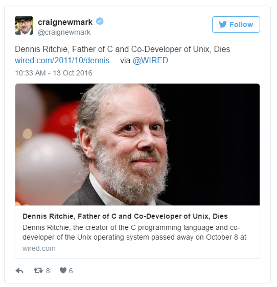 Dennis Ritchie 對于現代軟件技術的貢獻是毋庸置疑的,身為 C 語言同時也是 UNIX 之父,對于現代軟件以及系統的影響當然非常大。他在 2011 年 10 月 13 日于紐澤西過世,當時引起很多科技業重量級人物的哀悼。不外,基于某些錯誤,他近日在 Twitter 上“再度”過世了一次。 在社交網站上都有一些演算法的機制,會回顧過去幾年這一天所發生的信息。有的時候我們一不小心沒有留意日期,就會誤認為是當天所發生的事情。而這個在美國科技圈發生的烏龍事件,不清晰是不是也是由于這個演算法所引起的。 事情到底是誰開始?不外根據 fossbytes的考證,溯源追蹤到 CNET 的科技界著名記者 Om Malik,他在 Twitter 發了一篇引述 Wired 報導、哀悼 Dennis Ritchie 的推文。而 Google 的 CEO Sundar Pichai 也推了這篇文章。 因為 Om Malik 的影響力,接下來又引出了兩位科技界的大咖的轉推。像是 Craig Newmark,Craigslist 的創辦人。 Katherine Maher 目前負責主管 Wikimedia 基金會。 因為這些科技大咖的影響力,當然這個“謠言”就開始在科技圈傳開了,一大堆人開始在 Twitter 上對 Dennis Ritchie 進行哀悼。 事情一直到 Om Malik 自己發現了錯誤,他連忙在自己的博客上發布了一篇報歉文,表示自己分享了一篇 Wired 的報導,卻沒有留意到報導的日期,沒有發現 Dennis Ritchie 早在與喬布斯過世的統一年就“已經”過世了。 不外,往好處想也由于這個原因,讓 Dennis Ritchie 他對于眾人的貢獻再度被喚醒。 |