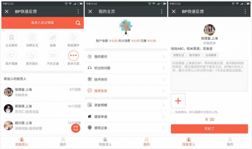 第2次轉型,聚份子將形式做得更輕,全部項目的中心業務環繞BP付費投遞,做創投界的“分答”。出資人在渠道上自行定制發問報價,創業者上載自個的BP,向心儀的出資人付費發問,這么一方面假如出資人看到并不是太符合要求的項目也有有些的時刻補償,一起創業者也能夠經過自動投遞迅速取得出資反應。別的感興趣的“圍觀大眾”還能夠挑選“偷聽”,低本錢學習出資人對項目的判別及看法。經過這種方式,聚份子一個月內就協助30多個項目迅速地找到意向的出資組織,最快的耗時不到10分鐘。并且在這30幾個項目中,很多的是對本來傳統項目進行改造的二三線城市創業者,遍及現階段都有數百萬乃至千萬的流水,而這些項目是本來的投融資渠道效勞不到的。