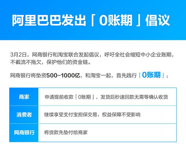 3月2日,網商銀行和淘寶聯合建議倡議,呼吁全社會縮短中小企業賬期,不截流不拖欠,維護他們的資金鏈;網商銀行將墊資500-1000億,和淘寶一起,