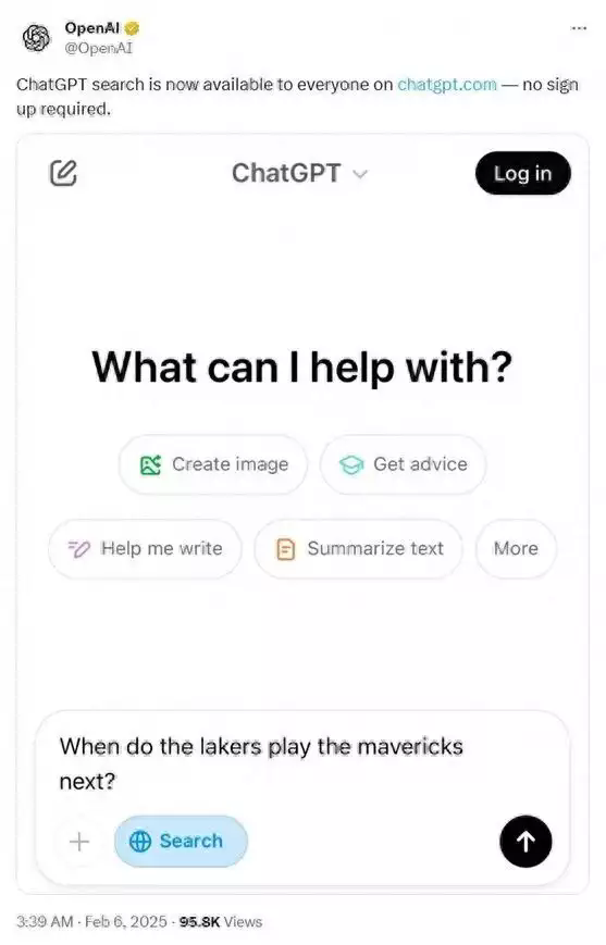 2025 年 2 月 6 日凌晨 3 點,OpenAI 宣布向所有用戶開放 ChatGPT 搜索功能,且無需注冊。這一舉措可能對谷歌等傳統搜索引擎造成沖擊,給搜索引擎市場帶來多方面變革,
