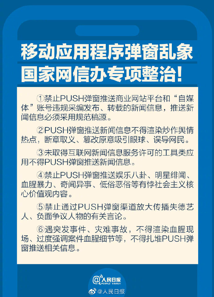 今起,國家網信辦將發動“清朗·移動使用程序PUSH彈窗突出問題專項整治”,清晰六項整改要求:①禁止推送商業網站途徑和“自媒體”賬號違規采編發布、轉載的新聞信息;