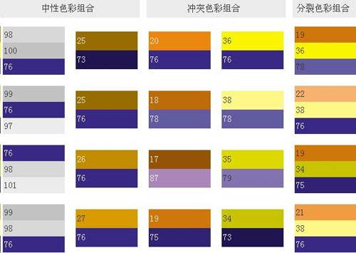 純藍和一些紅色結合在一起會發生藍紫色的感覺,這是色相環上最深的顏色。這類顏色調配可象征權威,表現出皇家的氣度,就象夏日的梅子,有莫測高深的藍黑,藍紫和它的補色——黃橙調配起來,